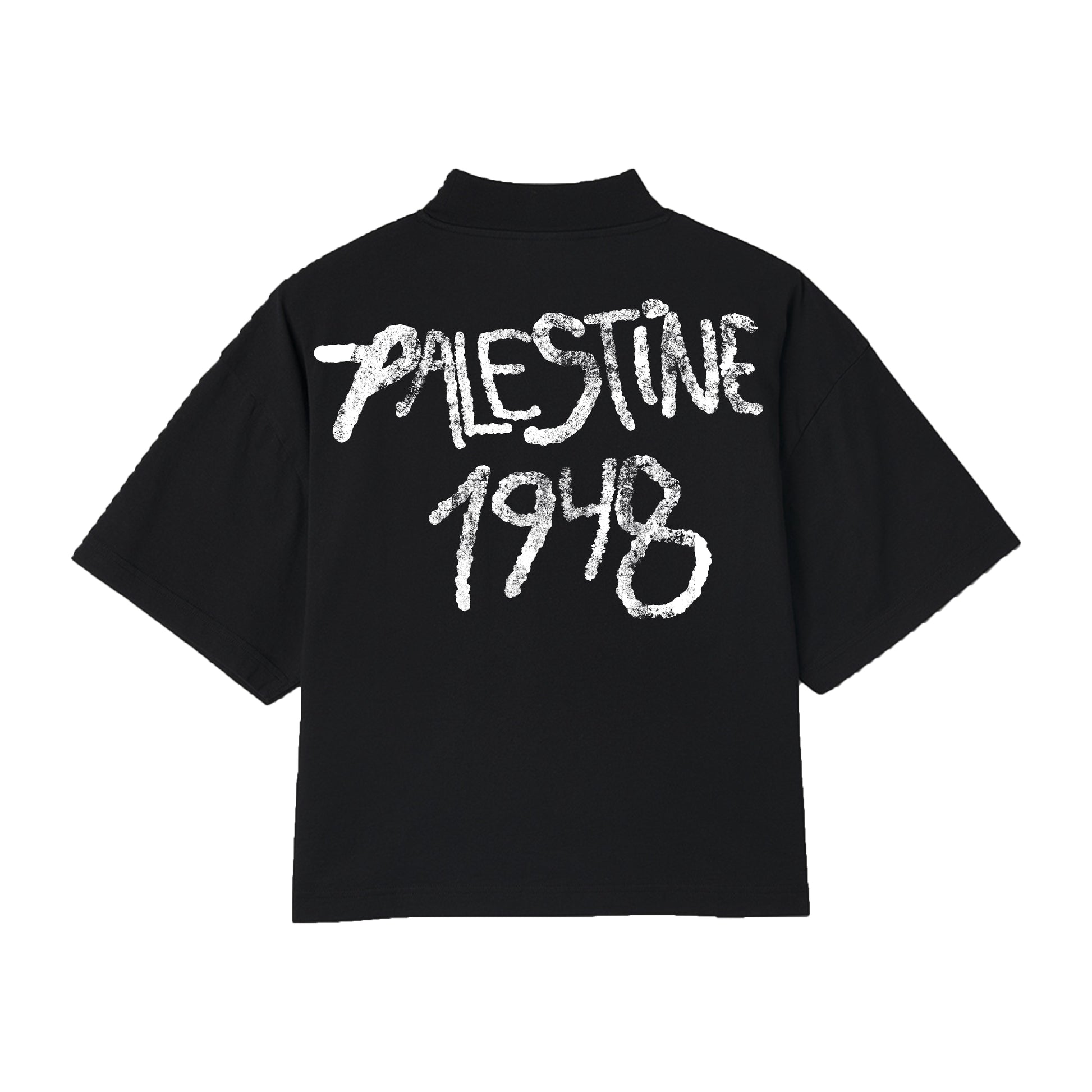 The "SKULLY" Boxy Crop Tee is a must-have for anyone looking to make a statement. Made with soft and comfortable fabric, this tee features a bold "PALESTINE" design that pays homage to a historic year. Show your support with this stylish and impactful top.